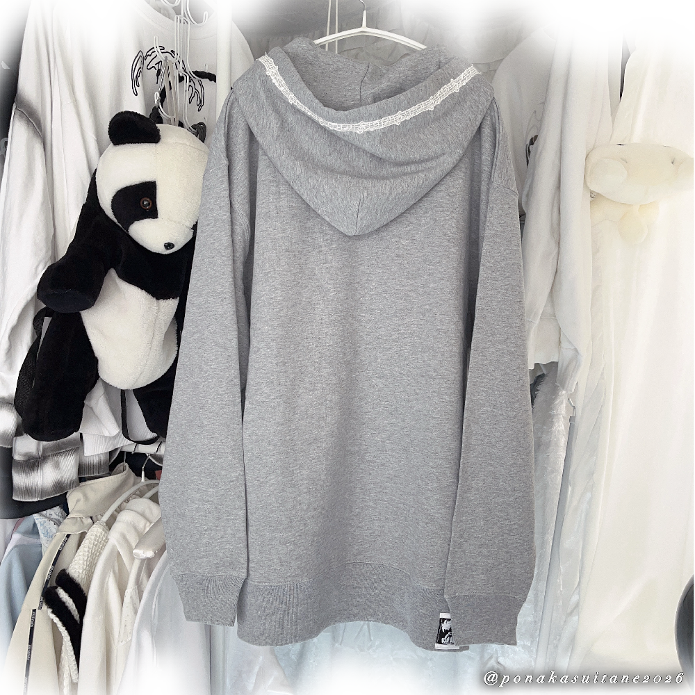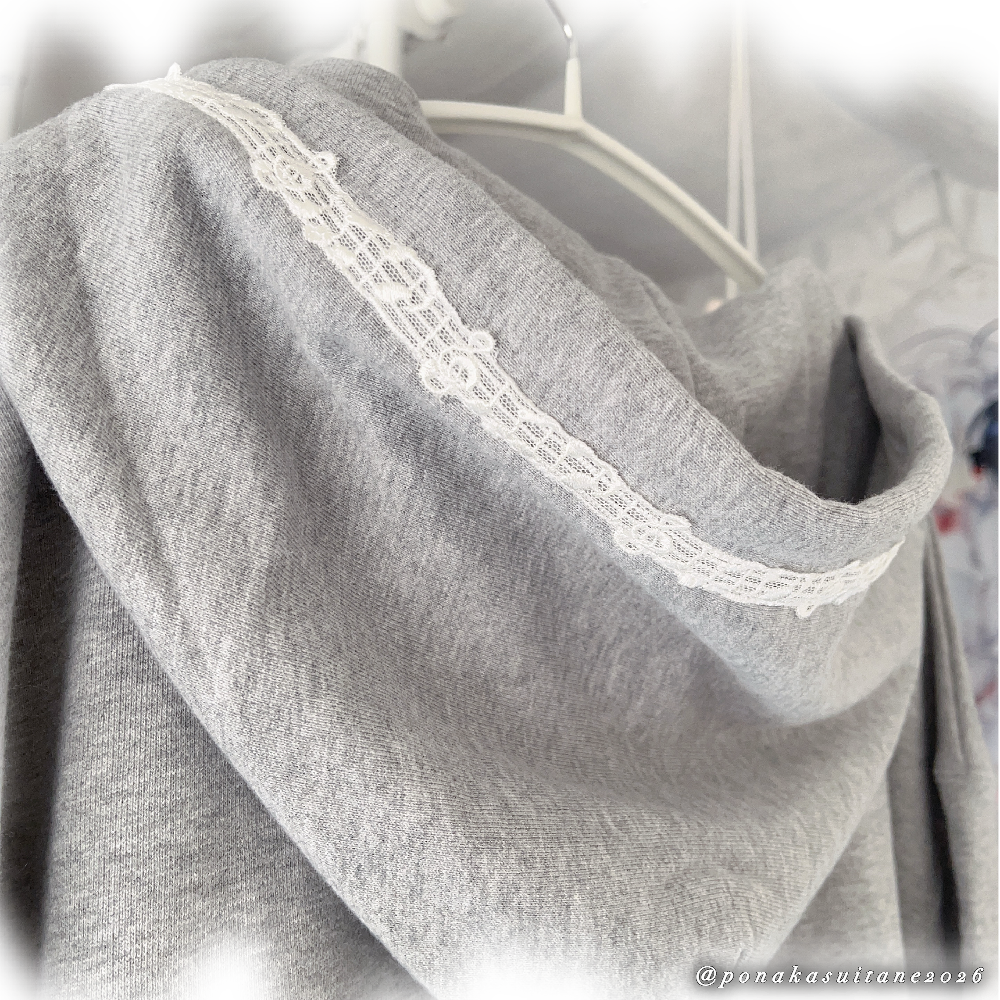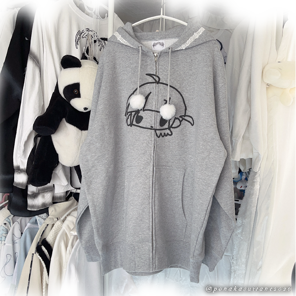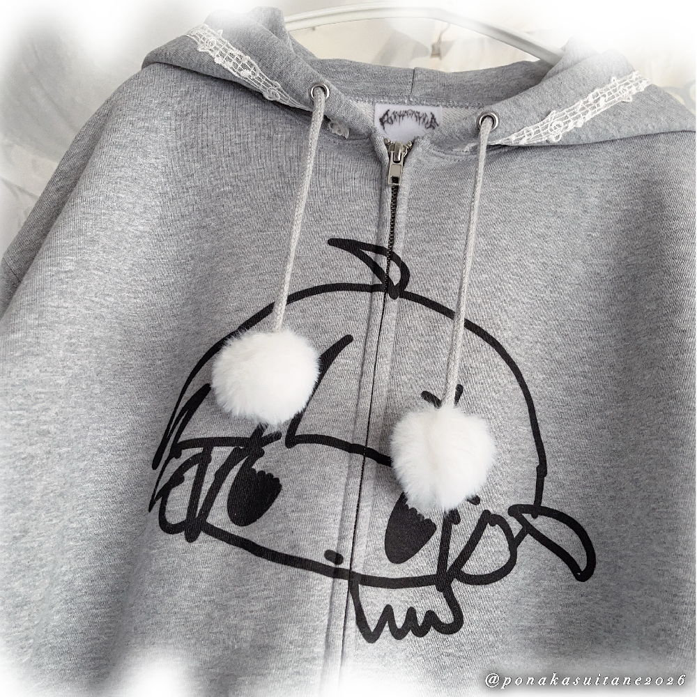胸元に“ちぃもどき“ がプリントされた、ポンポン紐付きのふーでぃー。真夏以外、着れそうな。